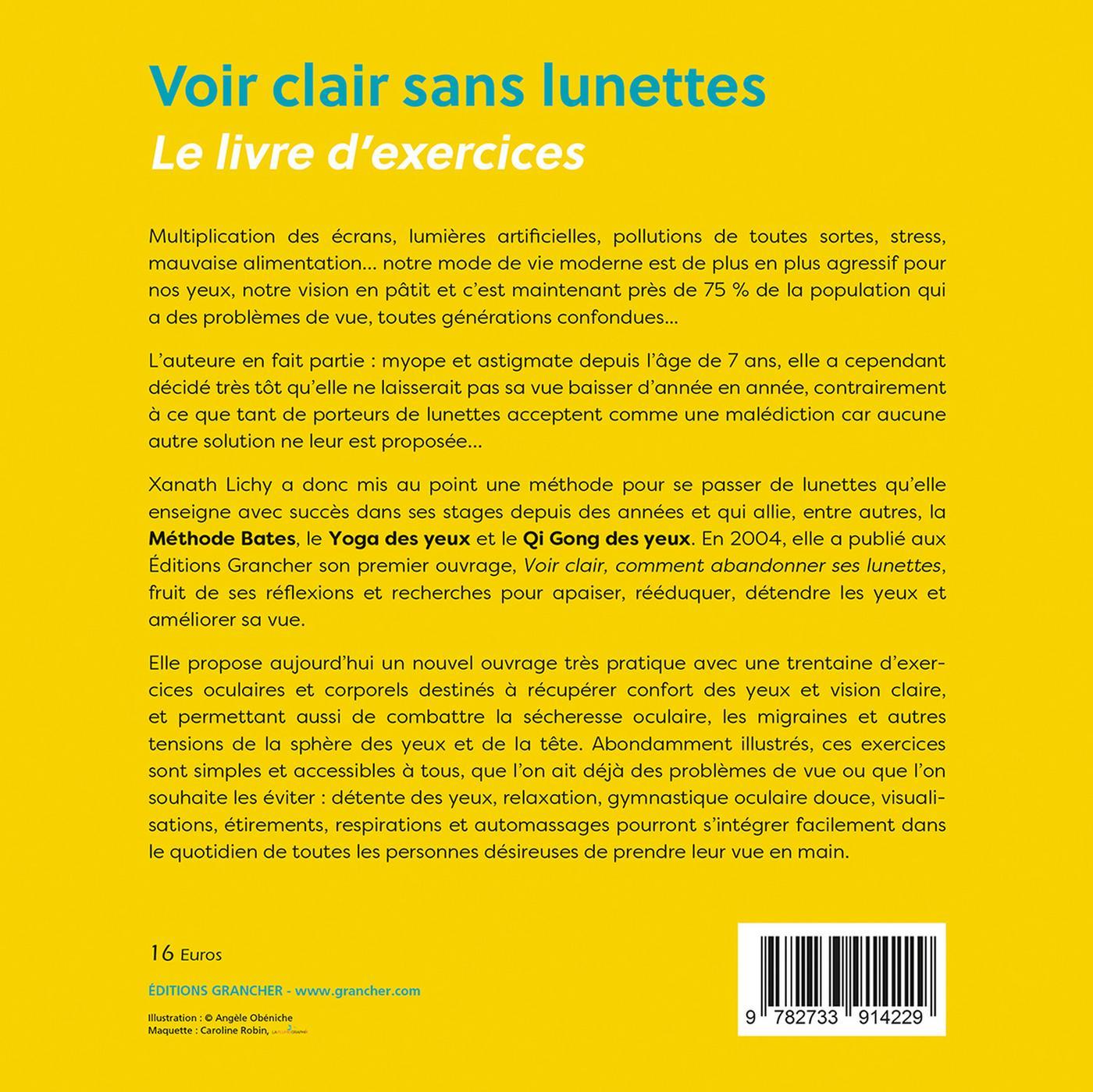 Multiplication des écrans, lumières artificielles, pollutions de toutes sortes, stress, mauvaise alimentation… notre mode de vie moderne est de plus en plus agressif pour nos yeux, notre vision en pâtit et c’est maintenant près de 75 % de la population qui a des problèmes de vue, toutes générations confondues... L’auteure en fait partie : myope et astigmate depuis l’âge de 7 ans, elle a cependant décidé très tôt qu’elle ne laisserait pas sa vue baisser d’année en année, contrairement à ce que tant de porteurs de lunettes acceptent comme une malédiction car aucune autre solution ne leur est proposée… Xanath Lichy a donc mis au point une méthode pour se passer de lunettes qu’elle enseigne avec succès dans ses stages depuis des années et qui allie, entre autres, la Méthode Bates, le Yoga des yeux et le Qi Gong des yeux. En 2004, elle a publié aux Éditions Grancher son premier ouvrage, Voir clair, comment abandonner ses lunettes, fruit de ses réflexions et recherches pour apaiser, rééduquer, détendre les yeux et améliorer sa vue. Elle propose aujourd’hui un nouvel ouvrage très pratique avec une trentaine d’exercices oculaires et corporels destinés à récupérer confort des yeux et vision claire, et permettant aussi de combattre la sécheresse oculaire, les migraines et autres tensions de la sphère des yeux et de la tête. Abondamment illustrés, ces exercices sont simples et accessibles à tous, que l’on ait déjà des problèmes de vue ou que l’on souhaite les éviter : détente des yeux, relaxation, gymnastique oculaire douce, visualisations, étirements, respirations et automassages pourront s’intégrer facilement dans le quotidien de toutes les personnes désireuses de prendre leur vue en main. Passionnée par les médecines douces, Xanath Lichy découvre qu’il est possible de rééduquer sa vision par des méthodes naturelles, notamment le Yoga des yeux. Elle s’y consacre pleinement, totalement motivée car très gênée par sa vision faible et parvient à abandonner progressivement ses lunettes. Elle crée en 1998 la méthode « Voir clair » qu’elle partage désormais au travers de stages, de conférences et de livres.