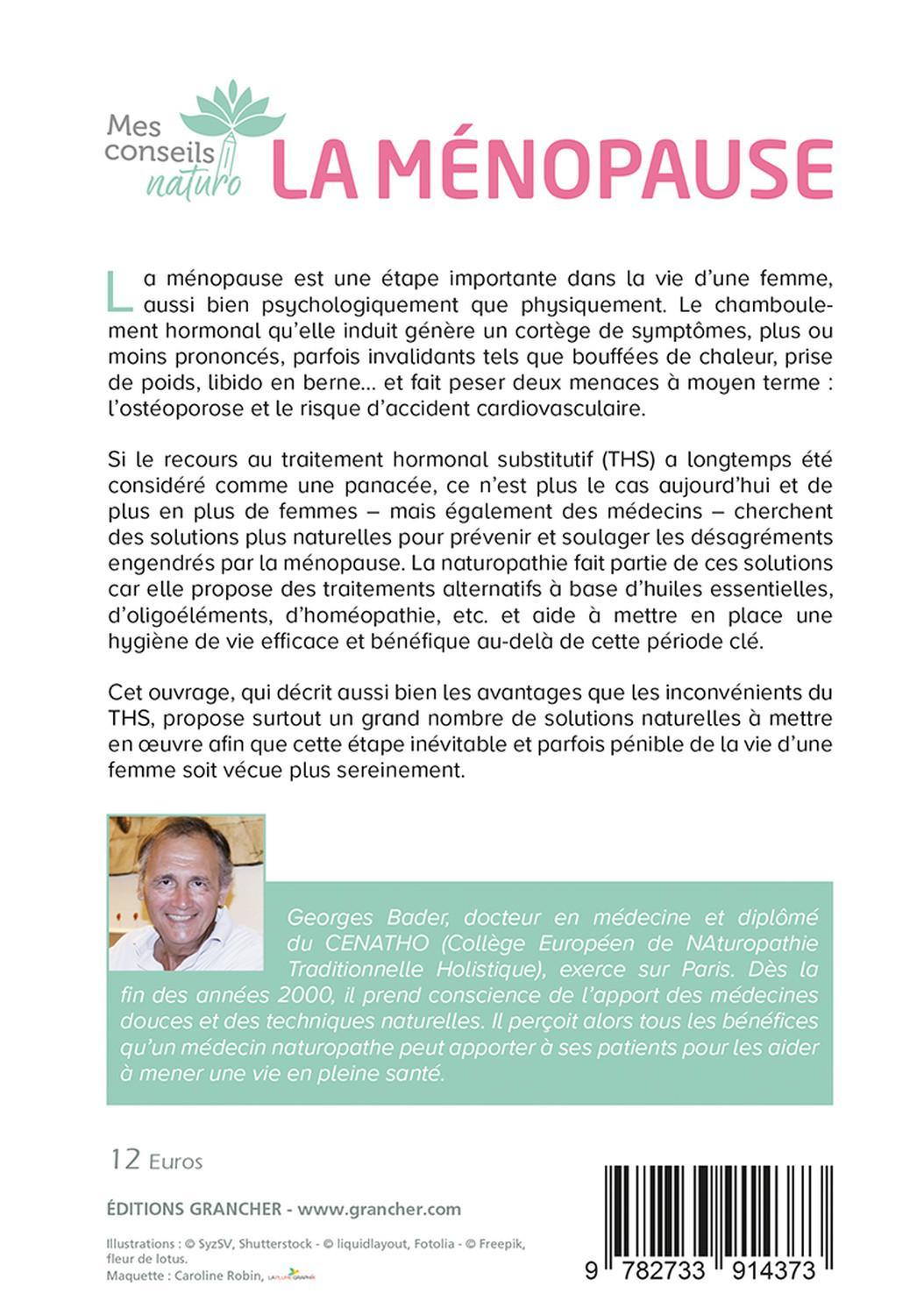 La ménopause est une étape importante dans la vie d'une femme, aussi bien psychologiquement que physiquement. Le chamboulement hormonal qu'elle induit génère un cortège de symptômes, plus ou moins prononcés, parfois invalidants tels que bouffées de chaleur, prise de poids, libido en berne… et fait peser sur la patiente deux menaces à moyen terme : l'ostéoporose et le risque d'accident cardiovasculaire. Si le recours au traitement hormonal substitutif (THS) a longtemps été considéré comme une panacée, ce n'est plus le cas aujourd'hui et de plus en plus de femmes - mais également des médecins - cherchent des solutions plus naturelles pour prévenir et soulager les désagréments engendrés par la ménopause. La naturopathie fait partie de ces solutions car elle propose des traitements alternatifs à base d'huiles essentielles, oligoéléments, homéopathie, etc. et aide à mettre en place une hygiène de vie efficace et bénéfique au-delà de cette période clé. Cet ouvrage qui décrit aussi bien les avantages que les inconvénients du THS propose surtout un grand nombre de solutions naturelles à mettre en œuvre afin que cette étape inévitable et parfois pénible de la vie d'une femme, soit vécue plus sereinement.