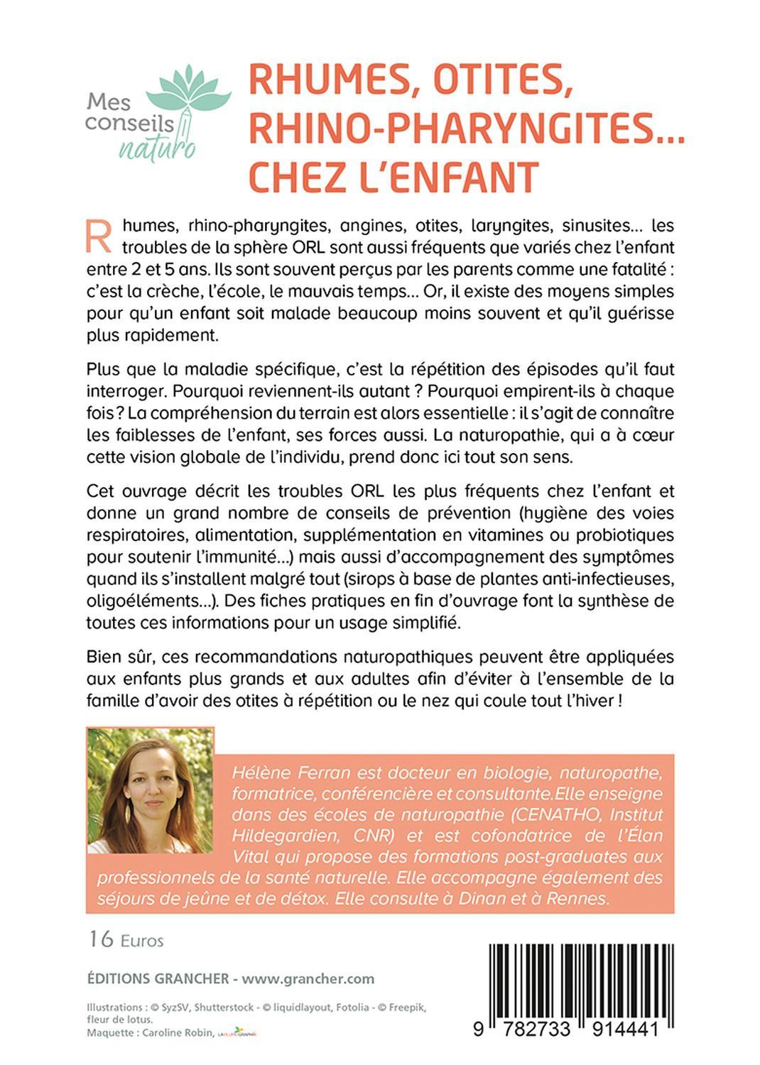 Rhume, rhino-pharyngite, angine, otite, laryngite, sinusite…, les troubles de la sphère ORL sont aussi fréquents que variés chez l’enfant entre 2 et 5 ans. Ils sont souvent perçus par les parents comme une fatalité : c’est la crèche, l’école, le mauvais temps… Or, il existe des moyens simples pour qu’un enfant soit malade beaucoup moins souvent et qu’il guérisse plus rapidement. Plus que la maladie spécifique, c’est la répétition des épisodes qu’il faut interroger. Pourquoi reviennent-ils autant ? Pourquoi empirent-ils à chaque fois ? La compréhension du terrain est alors essentielle : il s’agit de connaître les faiblesses de l’enfant, ses forces aussi. La naturopathie, qui a à cœur cette vision globale de l’individu, prend donc ici tout son sens. Cet ouvrage décrit les troubles ORL les plus fréquents chez l’enfant et donne un grand nombre de conseils de prévention (hygiène des voies respiratoires, alimentation, supplémentation en vitamines ou probiotiques pour soutenir l’immunité…) mais aussi d’accompagnement des symptômes quand ils s’installent malgré tout (sirops à base de plantes anti-infectieuses, oligoéléments…). Des fiches pratiques en fin d’ouvrage font la synthèse de toutes ces informations pour un usage simplifié. Bien sûr, ces recommandations naturopathiques peuvent être appliquées aux enfants plus grands et aux adultes afin d’éviter à l’ensemble de la famille d’avoir des otites à répétition ou le nez qui coule tout l’hiver !