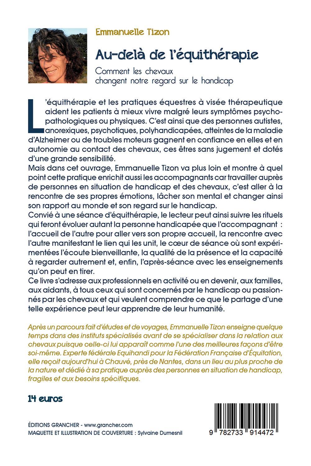 L’équithérapie et les pratiques équestres à visée thérapeutique aident les patients à mieux vivre malgré leurs symptômes psychopathologiques ou physiques. C’est ainsi que des personnes autistes, anorexiques, psychotiques, polyhandicapées, atteintes de la maladie d’Alzheimer ou de troubles moteurs gagnent en confiance en elles et en autonomie au contact des chevaux, ces êtres sans jugement et dotés d’une grande sensibilité. Mais dans cet ouvrage, Emmanuelle Tizon va plus loin et montre à quel point cette pratique enrichit aussi les accompagnants car travailler auprès de personnes en situation de handicap et des chevaux, c’est aller à la rencontre de ses propres émotions, lâcher son mental et changer ainsi son rapport au monde et son regard sur le handicap. Convié à une séance d’équithérapie, le lecteur peut ainsi suivre les rituels qui feront évoluer autant la personne handicapée que l’accompagnant : l’accueil de l’autre pour aller vers son propre accueil, la rencontre avec l’autre manifestant le lien qui les unit, le coeur de séance où sont expérimentées l’écoute bienveillante, la qualité de la présence et la capacité à regarder autrement et, enfin, l’après-séance avec les enseignements qu’on peut en tirer. Ce livre s’adresse aux professionnels en activité ou en devenir, aux familles, aux aidants, à tous ceux qui sont concernés par le handicap ou passionnés par les chevaux et qui veulent comprendre ce que le partage d’une telle expérience peut leur apprendre de leur humanité.