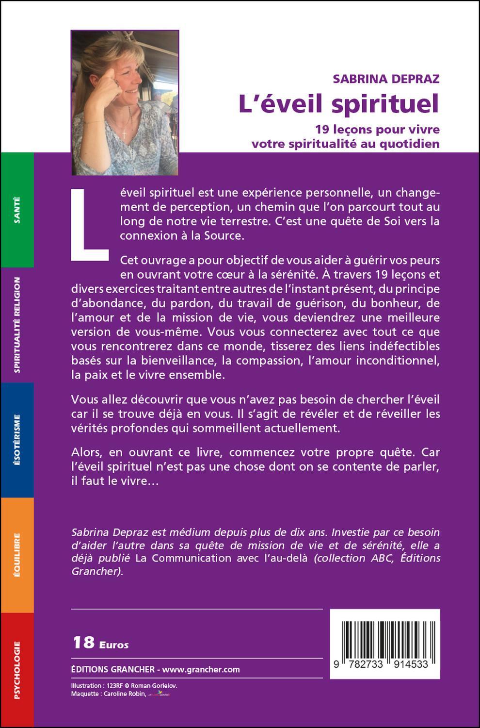 L’éveil spirituel est une expérience personnelle, un changement de perception, un chemin que l’on parcourt tout au long de notre vie terrestre. C’est une quête de Soi vers la connexion à la Source. Cet ouvrage a pour objectif de vous aider à guérir vos peurs en ouvrant votre cœur à la sérénité. À travers 19 leçons et divers exercices traitant entre autres de l’instant présent, du principe d’abondance, du pardon, du travail de guérison, du bonheur, de l’amour et de la mission de vie, vous deviendrez une meilleure version de vous-même. Vous vous connecterez avec tout ce que vous rencontrerez dans ce monde, tisserez des liens indéfectibles basés sur la bienveillance, la compassion, l’amour inconditionnel, la paix et le vivre ensemble. Vous allez découvrir que vous n’avez pas besoin de chercher l’éveil car il se trouve déjà en vous. Il s’agit de révéler et de réveiller les vérités profondes qui sommeillent actuellement. Alors, en ouvrant ce livre, commencez votre propre quête. Car l’éveil spirituel n’est pas une chose dont on se contente de parler, il faut le vivre…