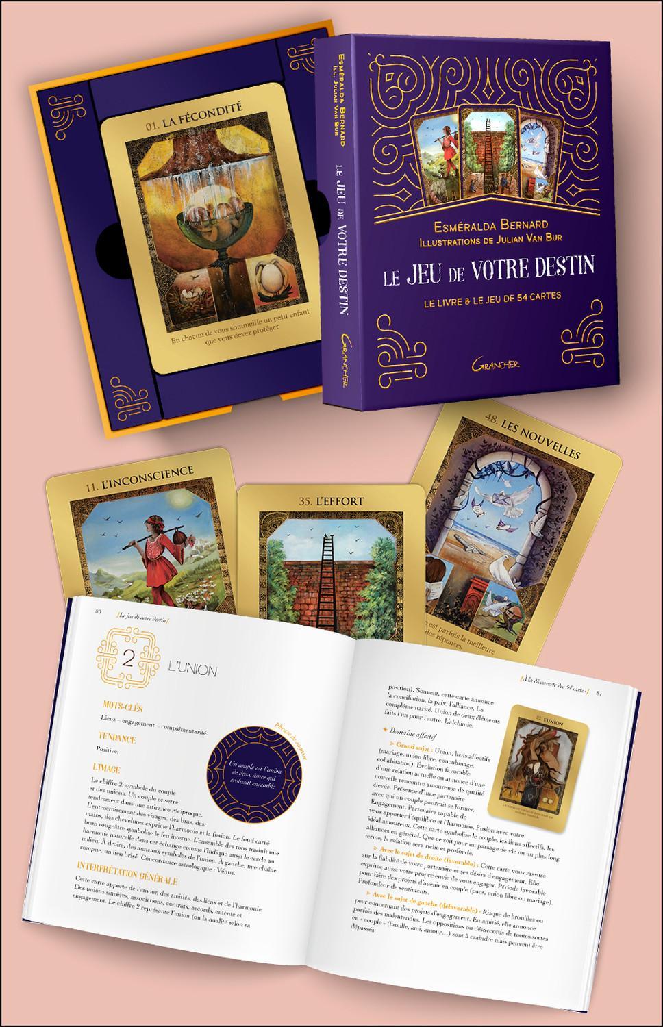 Devenez créateur et acteur de votre vie avec ce jeu divinatoire original imaginé par Esméralda Bernard qui pratique la voyance depuis plus de 30 ans. Grâce à la richesse de ses symboles, le Jeu de votre destin vous guide dans vos choix et répond aux questions que vous vous posez dans le domaine qui vous tient à coeur : sentimental, professionnel ou matériel. Il offre des réponses claires et précises sur votre personnalité, le passé, le présent et le futur et vous entraîne dans un fascinant voyage sur la voie de la découverte intérieure par les messages spirituels et les processus de réflexion qu’induit chaque carte. Ce coffret comprend : le jeu de 54 cartes illustrées par un artiste de renom, Julian Van Bur. Le livre complet avec des clés d'interprétation pour chaque carte et des exemples de tirages.