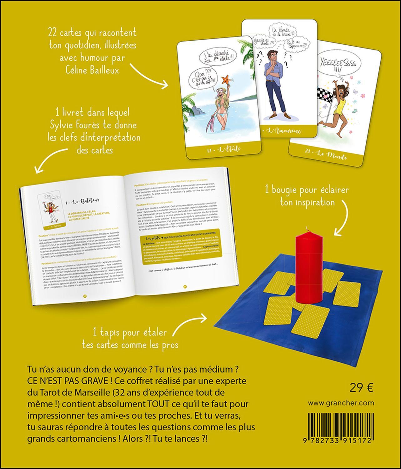 Tu n’as aucun don de voyance ? Tu n’es pas médium ? CE N’EST PAS GRAVE ! Ce coffret réalisé par une experte du Tarot de Marseille (32 ans d’expérience tout de même !) contient absolument TOUT ce qu’il te faut pour impressionner tes ami(e)s ou tes proches. Et tu verras, tu sauras répondre à toutes les questions comme les plus grands cartomanciens ! Alors ?! Tu te lances ?!!