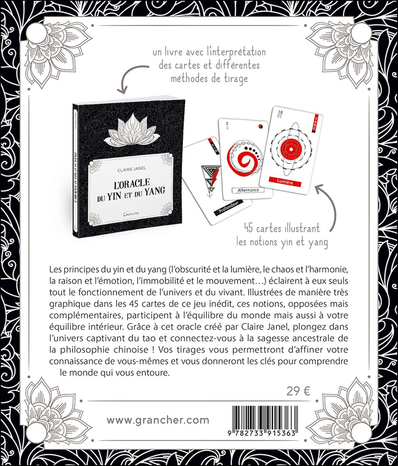 Les principes du yin et du yang (l’obscurité et la lumière, le chaos et l’harmonie, la raison et l’émotion, l’immobilité et le mouvement…) éclairent à eux seuls tout le fonctionnement de l’univers et du vivant. Illustrées de manière très graphique dans les 45 cartes de ce jeu inédit, ces notions, opposées mais complémentaires, participent à l’équilibre du monde mais aussi à votre équilibre intérieur. Grâce à cet oracle créé par Claire Janel, plongez dans l’univers captivant du tao et connectez-vous à la sagesse ancestrale de la philosophie chinoise?! Vos tirages vous permettront d’affiner votre connaissance de vous-mêmes et vous donneront les clés pour comprendre le monde qui vous entoure.