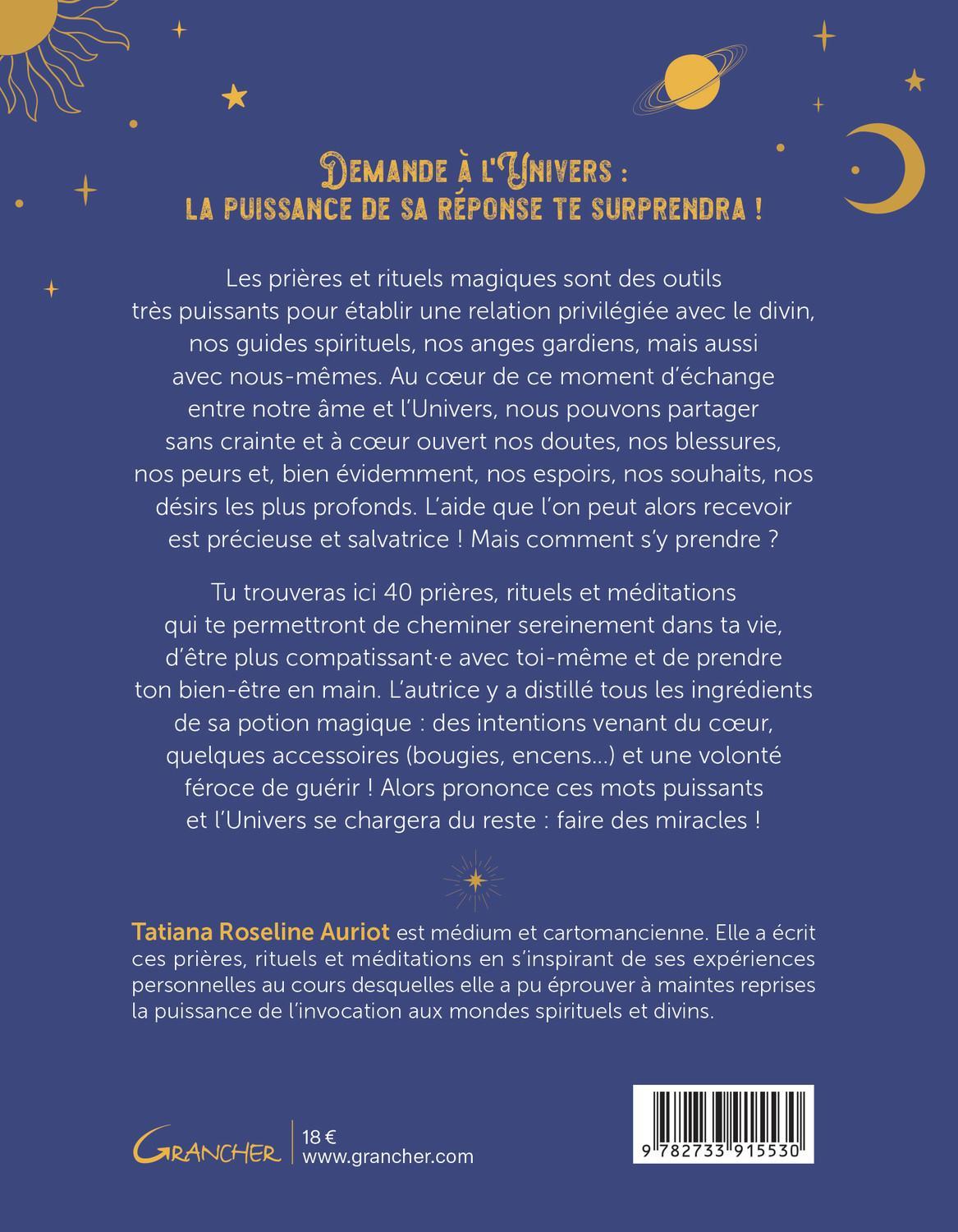 Les prières et rituels magiques sont des outils très puissants pour établir une relation privilégiée avec le divin, nos guides spirituels, nos anges gardiens, mais aussi avec nous-mêmes. Au cœur de ce moment d’échange entre notre âme et l’Univers, nous pouvons partager sans crainte et à cœur ouvert nos doutes, nos blessures, nos peurs et, bien évidemment, nos espoirs, nos souhaits, nos désirs les plus profonds. L’aide que l’on peut alors recevoir est précieuse et salvatrice ! Mais comment s’y prendre ? Tu trouveras ici 40 prières, rituels et méditations qui te permettront de cheminer sereinement dans ta vie, d’être plus compatissant·e avec toi-même et de prendre ton bien-être en main. L’autrice y a distillé tous les ingrédients de sa potion magique : des intentions venant du cœur, quelques accessoires (bougies, encens…) et une volonté féroce de guérir ! Alors prononce ces mots puissants et l’Univers se chargera du reste : faire des miracles !