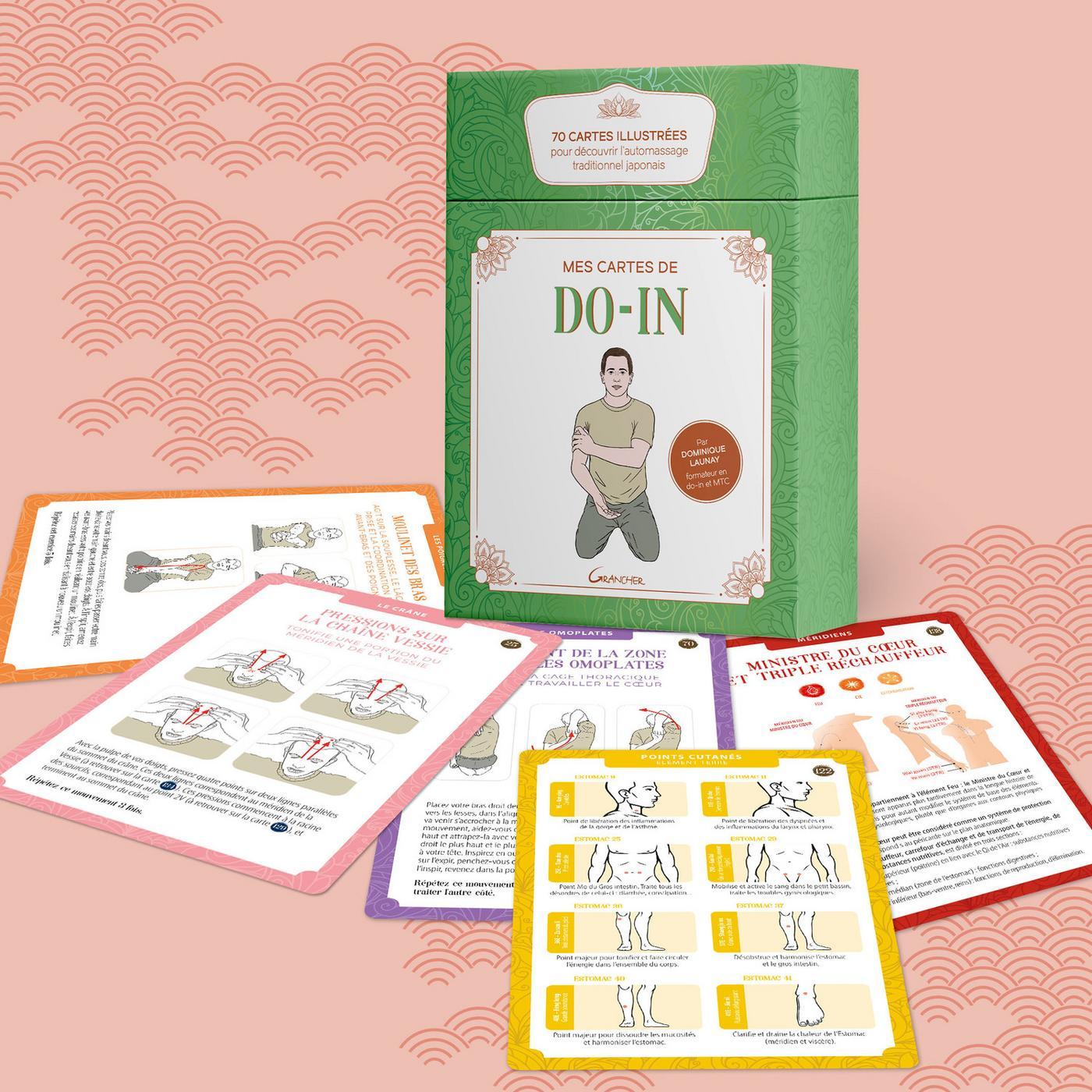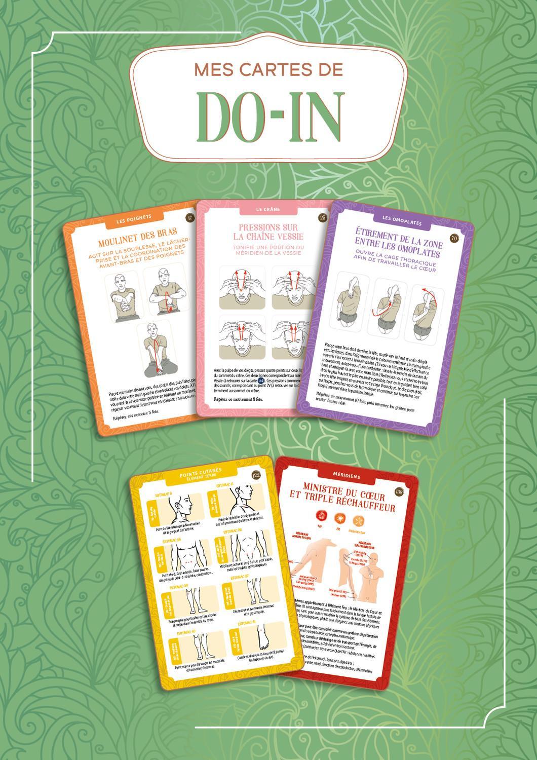 Activez en quelques minutes vos points de guérison ! Découvrez la discipline millénaire du do-in en vous appropriant des gestes simples d'automassage visant à préserver votre santé et à vous procurer du bien-être. Étalez les cartes devant vous pour créer des séances sur mesure en fonction de vos besoins et envies du jour et traitez vos petits maux du quotidien grâce à un index des pathologies renvoyant aux zones et aux points cutanés à masser. Avec ce coffret, alliez le plaisir de la détente et bienfaits de la médecine traditionnelle chinoise !