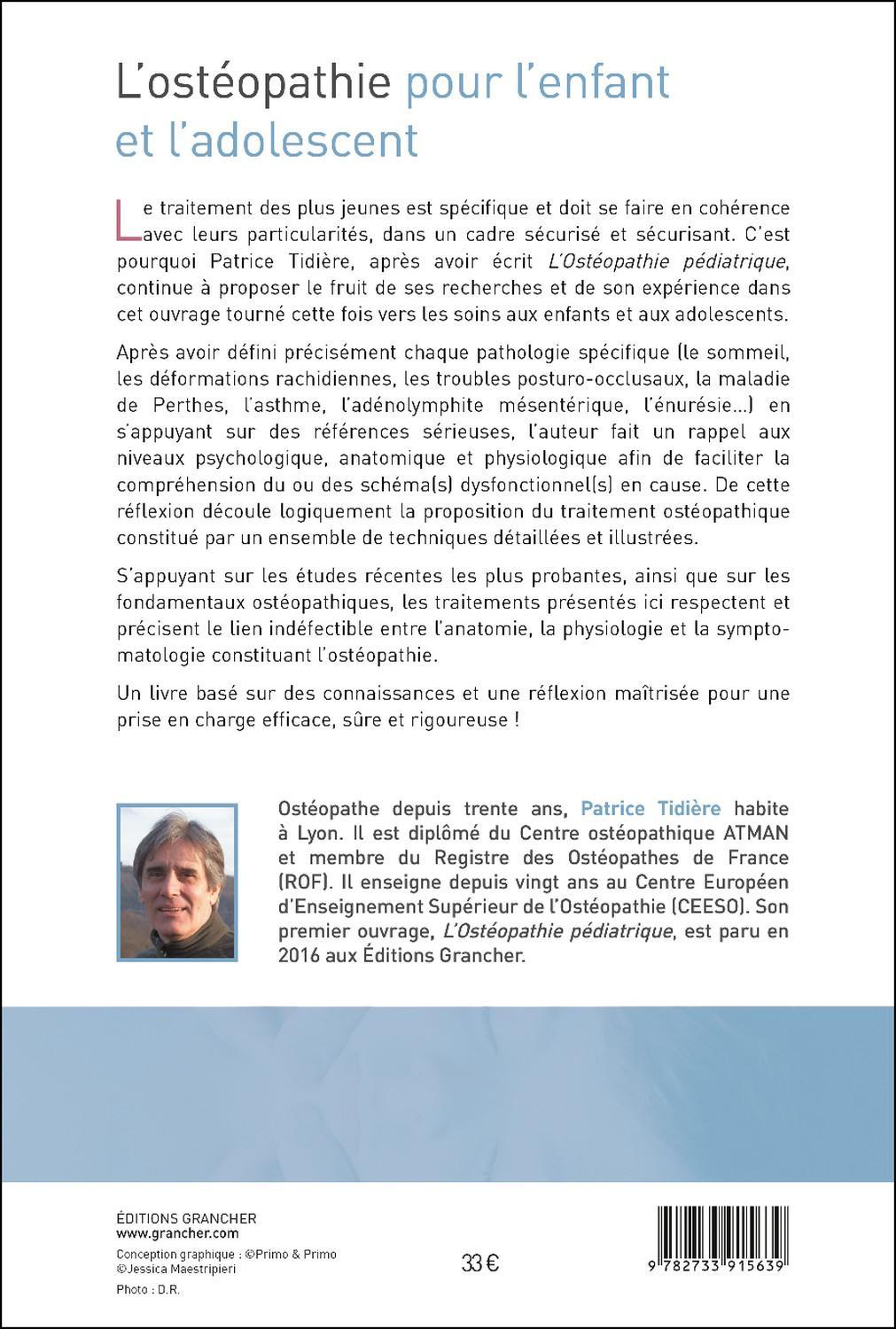 Le traitement des plus jeunes est spécifique et doit se faire en cohérence avec leurs particularités, dans un cadre sécurisé et sécurisant. C'est pourquoi Patrice Tidière, après avoir écrit L'Ostéopathie pédiatrique, continue à proposer le fruit de ses recherches et de son expérience dans cet ouvrage tourné cette fois vers les soins aux enfants et aux adolescents. Après avoir défini précisément chaque pathologie spécifique (le sommeil, les déformations rachidiennes, les troubles posturo-occlusaux, la maladie de Perthes, l'asthme, l'adénolymphite mésentérique, l'énurésie…) en s'appuyant sur des références sérieuses, l'auteur fait un rappel aux niveaux psychologique, anatomique et physiologique afin de faciliter la compréhension du ou des schéma(s) dysfonctionnel(s) en cause. De cette réflexion découle logiquement la proposition du traitement ostéopathique constitué par un ensemble de techniques détaillées et illustrées. S'appuyant sur les études récentes les plus probantes, ainsi que sur les fondamentaux ostéopathiques, les traitements présentés ici respectent et précisent le lien indéfectible entre l'anatomie, la physiologie et la symptomatologie constituant l'ostéopathie. Un livre basé sur des connaissances et une réflexion maîtrisée pour une prise en charge efficace, sûre et rigoureuse !
