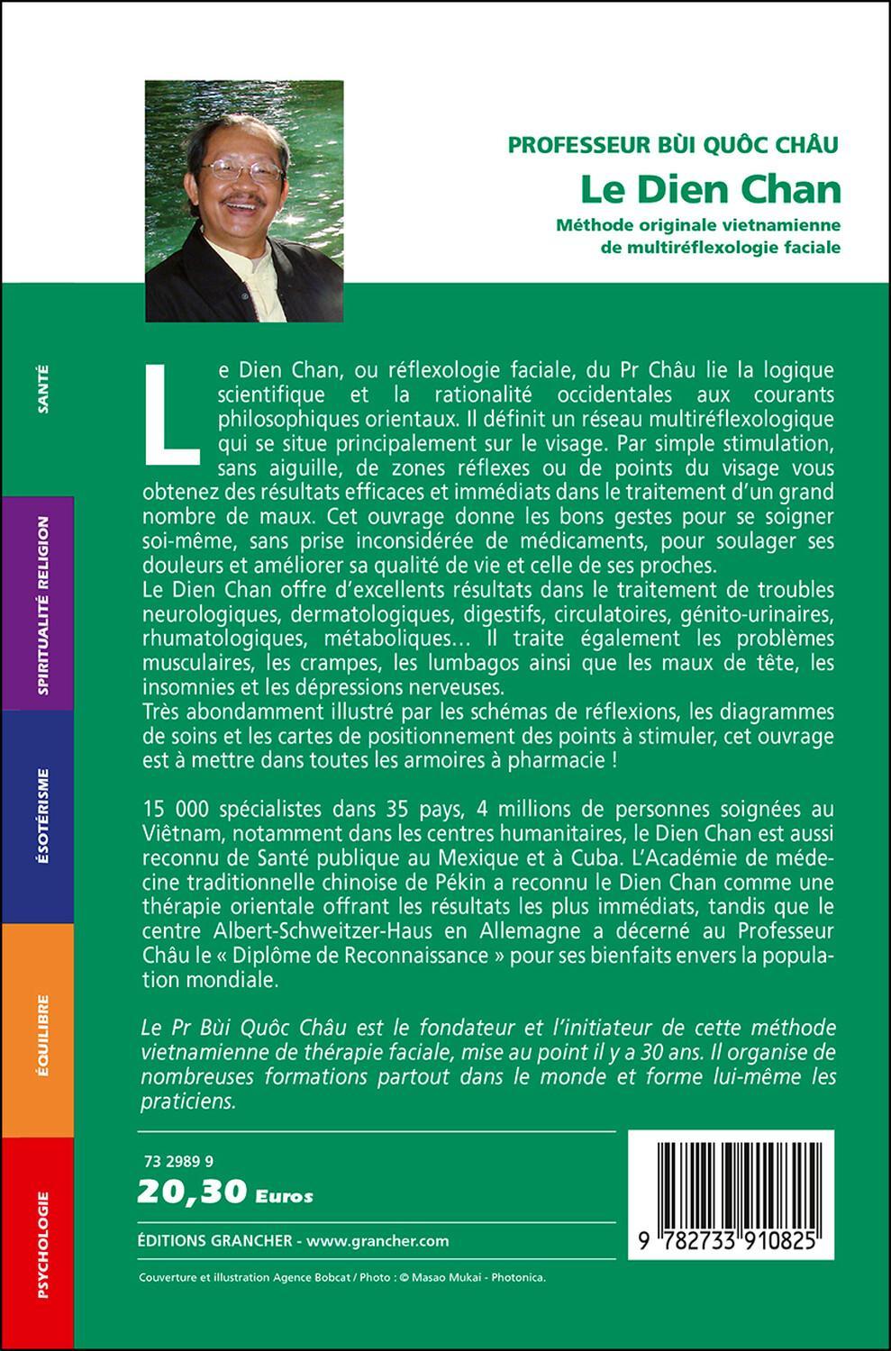 Le Dien Chan, ou réflexologie faciale, du Pr. Châu lie la logique scientifique et la rationalité occidentales aux courants philosophiques orientaux. Il définit un réseau multiréfléxologique qui se situe principalement sur le visage. Par simple stimulation, sans aiguille, des zones réflexes ou des points du visage, vous obtenez des résultats efficaces et immédiats dans le traitement d'un grand nombre de maux. Cet ouvrage donne les bons gestes pour se soigner soi-même, sans prise inconsidérée de médicaments, pour soulager ses douleurs et améliorer sa qualité de vie et celle de ses proches.