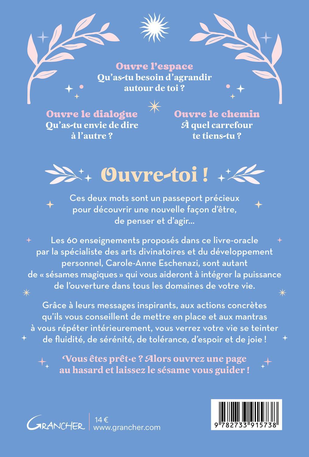 Ouvre-toi ! Ces deux mots sont un passeport précieux pour découvrir une nouvelle façon d’être, de penser et d’agir… Les 60 enseignements proposés dans ce livre-oracle par la spécialiste des arts divinatoires et du développement personnel, Carole-Anne Eschenazi, sont autant de « sésames magiques » qui vous aideront à intégrer la puissance de l’ouverture dans tous les domaines de votre vie. Grâce à leurs messages inspirants, aux actions concrètes qu’ils vous conseillent de mettre en place et aux mantras à vous répéter intérieurement, vous verrez votre vie se teinter de fluidité, de sérénité, de tolérance, d’espoir et de joie ! Vous êtes prêt·e ? Alors ouvrez une page au hasard et laissez le sésame vous guider !
