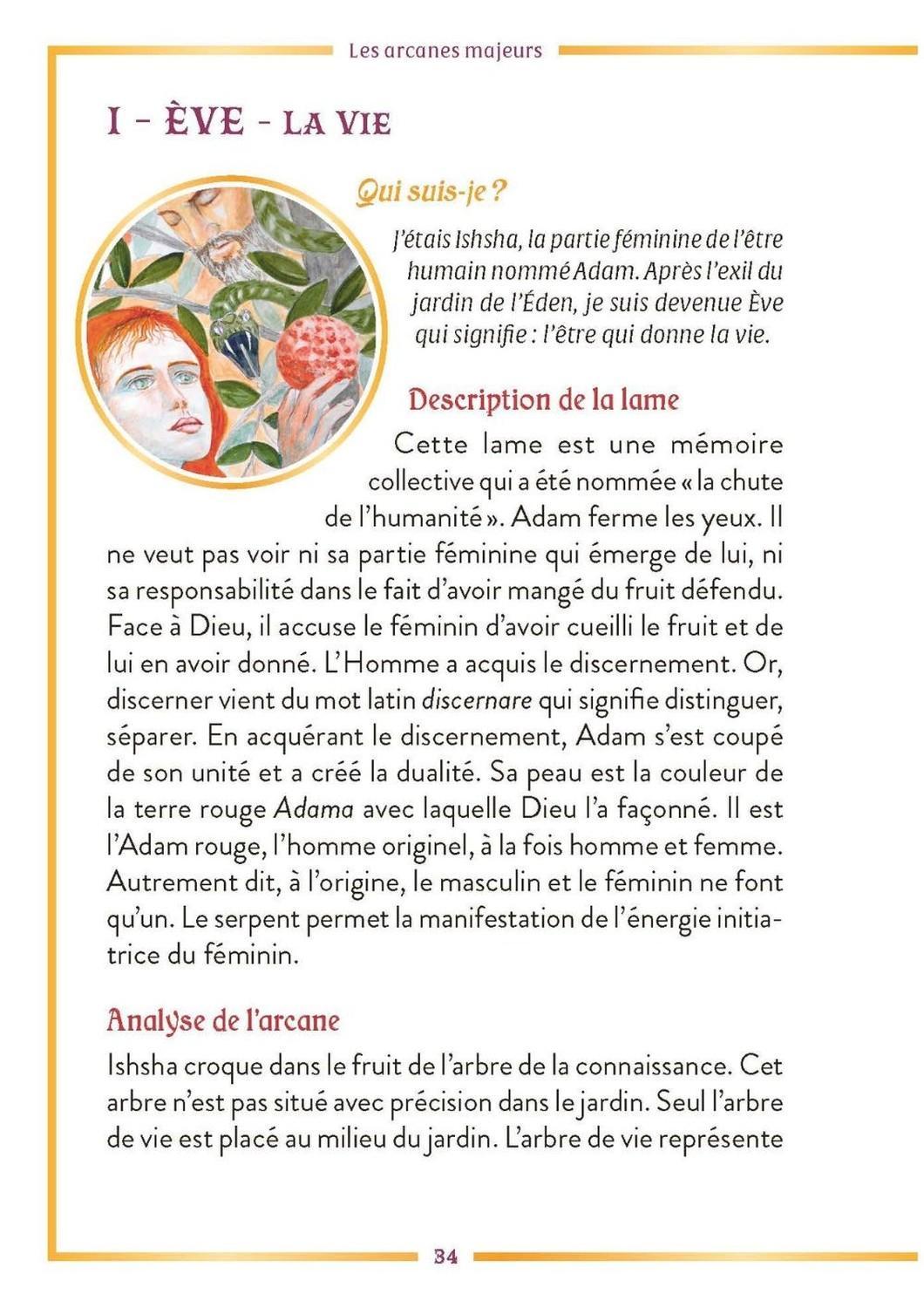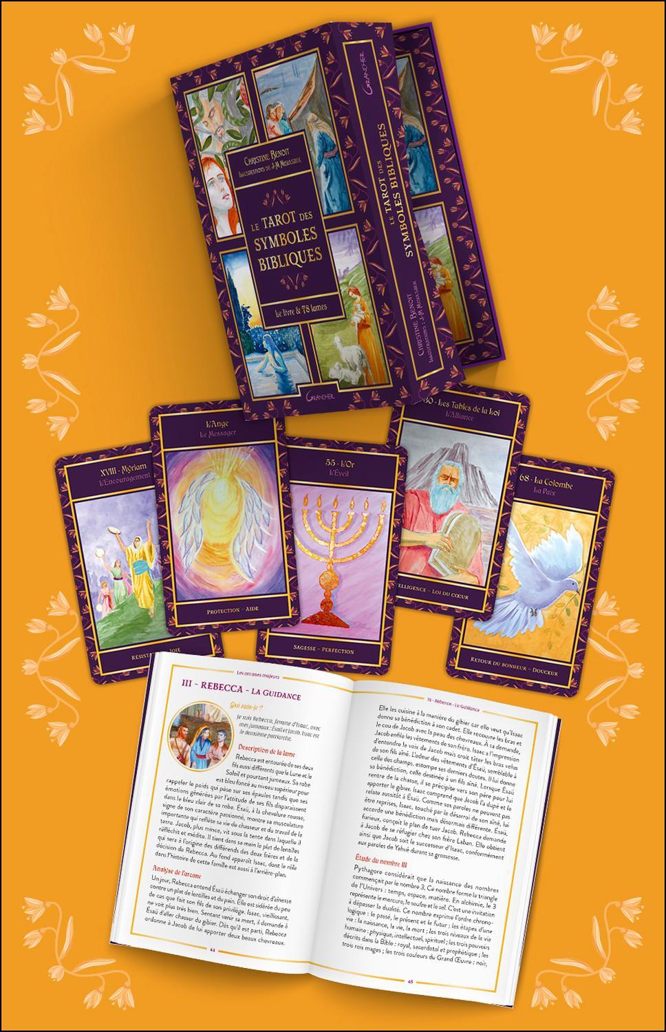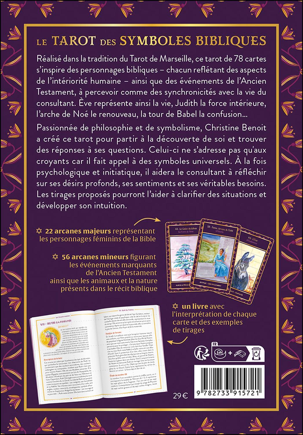 Réalisé dans la tradition du Tarot de Marseille, ce tarot de 78 cartes s’inspire des personnages bibliques – chacun reflétant des aspects de l’intériorité humaine?– ainsi que des événements de l’Ancien Testament, à prendre comme des invitations à comprendre le monde. Ève représente ainsi la vie, Judith la force intérieure, l’arche de Noé le renouveau, la tour de Babel la confusion… Passionnée de philosophie et de symbolisme, Christine Benoit a créé ce jeu pour partir à la découverte de soi grâce aux enseignements de la Bible. Celui-ci ne s’adresse pas aux croyants d’une religion en particulier puisqu’il fait appel à des symboles universels. À la fois psychologique et initiatique, ce tarot aidera le consultant à réfléchir sur ses désirs, ses sentiments et ses convictions. Les tirages proposés pourront également l’aider à éclaircir des zones d’ombre, à clarifier des situations.