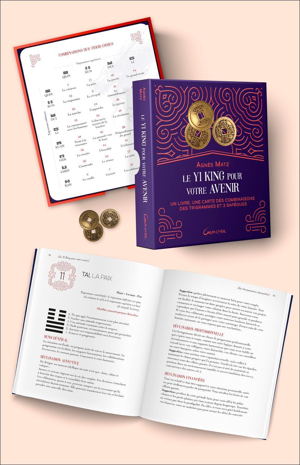 Outil divinatoire datant du Ier millénaire avant J.-C., le Yi King, avec ses 4 096 significations possibles, peut paraître complexe aux non-initiés. Consciente de cet écueil, Agnès Matz, psychologue s’appuyant sur cet outil dans sa pratique, a conçu ce coffret pour permettre la consultation de l’oracle sans recours à d’autres livres ou matériels. C’est pourquoi vous trouverez ici 3 sapèques gravées recto verso, une carte des combinaisons de trigrammes afin de trouver rapidement l’hexagramme correspondant à votre tirage ainsi qu’un ouvrage reposant sur un travail de réécriture rendant accessible des formulations hermétiques et métaphoriques. Les interprétations tant affectives que professionnelles ou financières vous guideront vers les changements à adopter pour la vie que vous souhaitez.