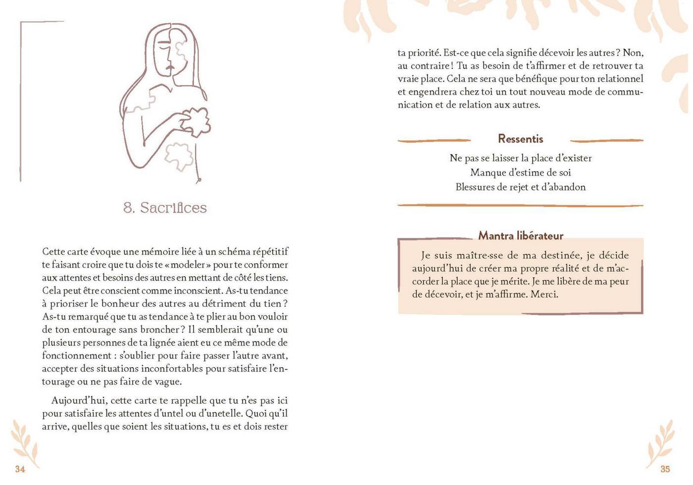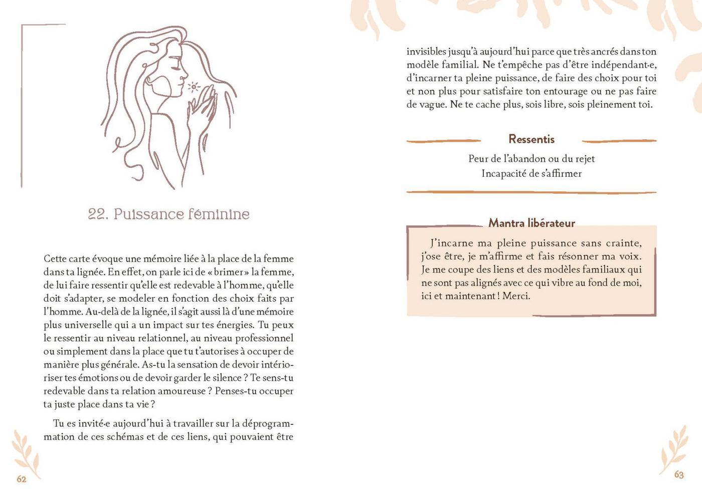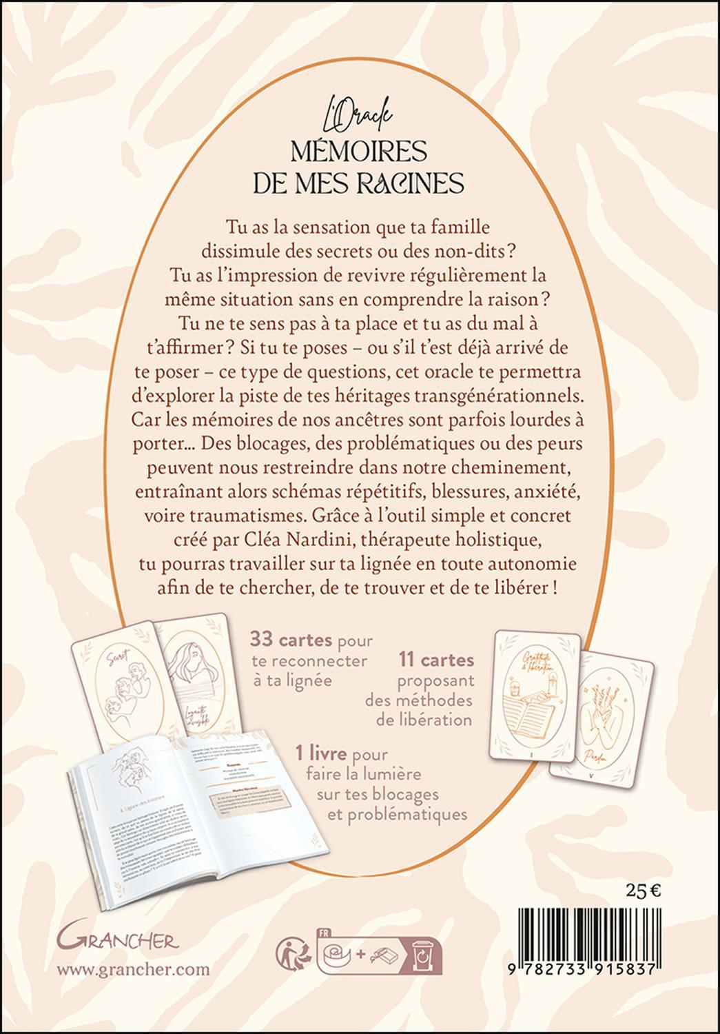 Tu as la sensation que ta famille dissimule des secrets ou des non-dits?? Tu as l’impression de revivre régulièrement la même situation sans en comprendre la raison?? Tu ne te sens pas à ta place et tu as du mal à t’affirmer?? Si tu te poses – ou s’il t’est déjà arrivé de te poser – ce type de questions, cet oracle te permettra d’explorer la piste de tes héritages transgénérationnels. Car les mémoires de nos ancêtres sont parfois lourdes à porter… Des blocages, des problématiques ou des peurs peuvent nous restreindre dans notre cheminement, entraînant alors schémas répétitifs, blessures, anxiété, voire traumatismes. Grâce à l’outil simple et concret créé par Cléa Nardini, thérapeute holistique, tu pourras travailler sur ta lignée en toute autonomie afin de te chercher, de te trouver et de te libérer !