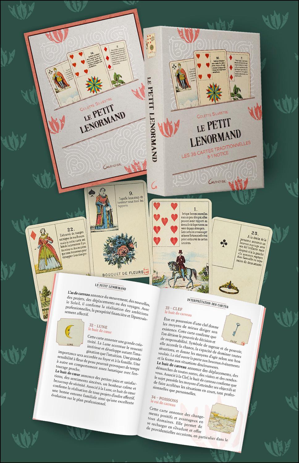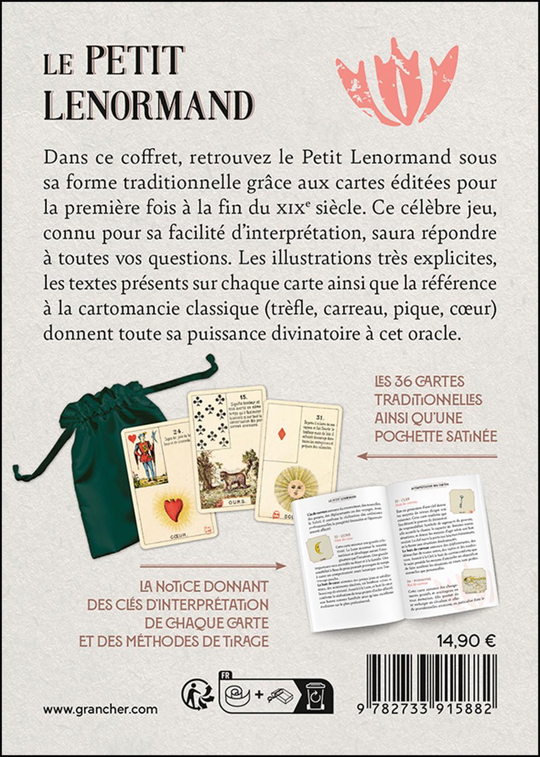 Retrouvez dans ce coffret le Petit Lenormand dans sa forme traditionnelle grâce aux cartes éditées pour la première fois à la fin du XIXe siècle. Ce célèbre jeu, connu pour sa facilité d’interprétation, saura répondre à toutes vos questions. Les illustrations très explicites, les textes présents sur chaque carte ainsi que la référence à la cartomancie classique (trèfle, carreau, pique, cœur) donnent toute sa puissance divinatoire à cet oracle. La notice donne des clés d’interprétation de chaque carte et des méthodes de tirage.