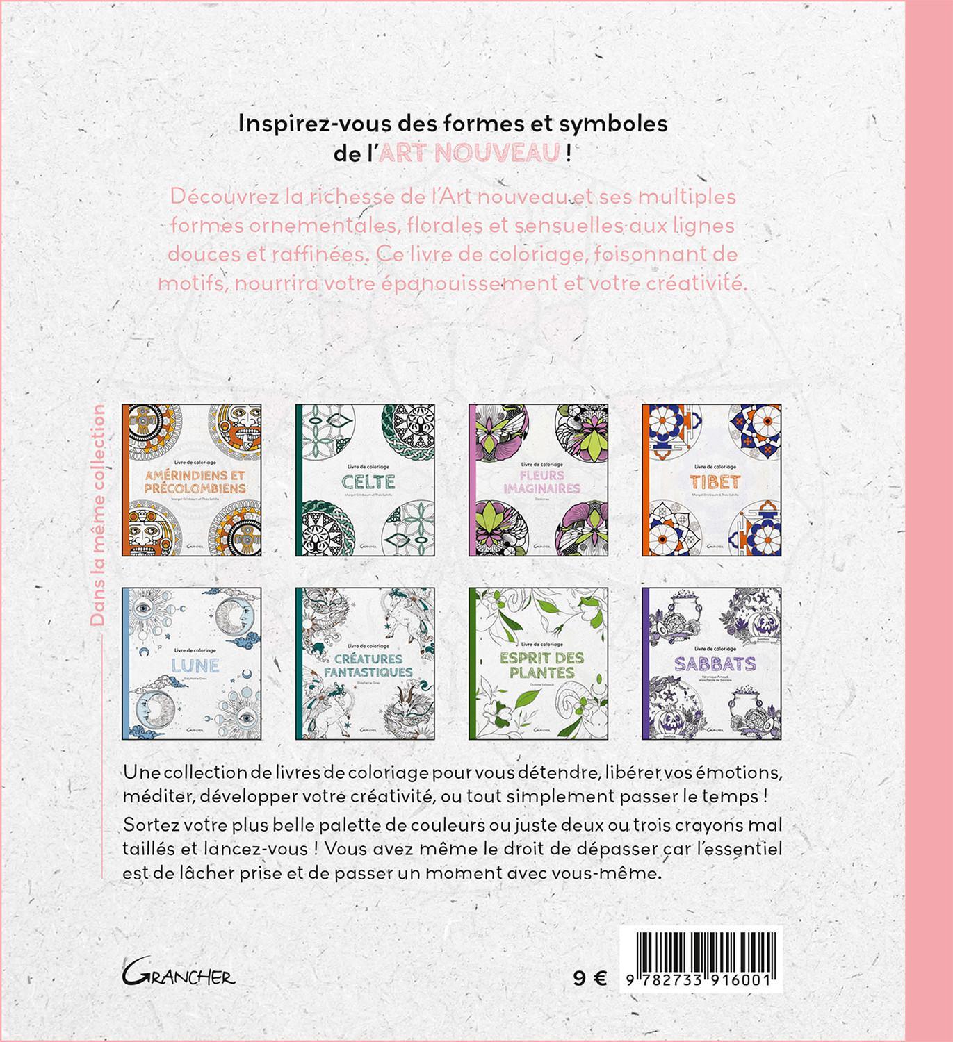Découvrez la richesse de l’Art nouveau et ses multiples formes ornementales, florales et sensuelles aux lignes douces et raffinées. Ce livre de coloriage, foisonnant de motifs, nourrira votre épanouissement et votre créativité. Une collection de livres de coloriage pour vous détendre, libérer vos émotions, méditer, développer votre créativité, ou tout simplement passer le temps ! Sortez votre plus belle palette de couleurs ou juste deux ou trois crayons mal taillés et lancez-vous ! Vous avez même le droit de dépasser car l’essentiel est de lâcher prise et de passer un moment avec vous-même.