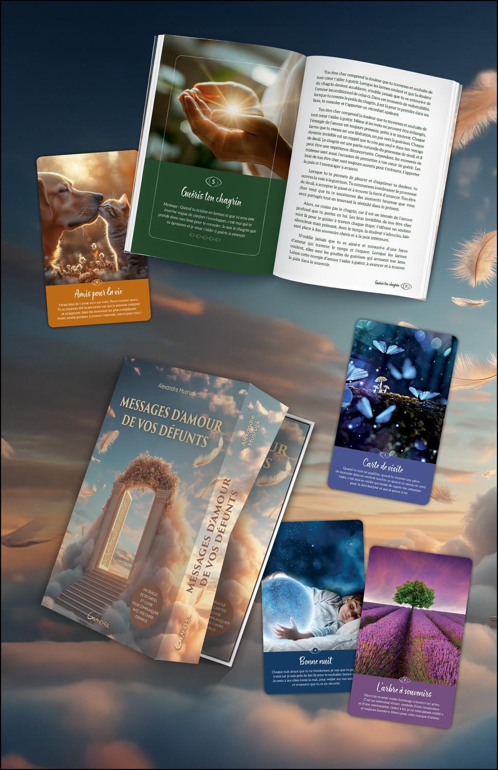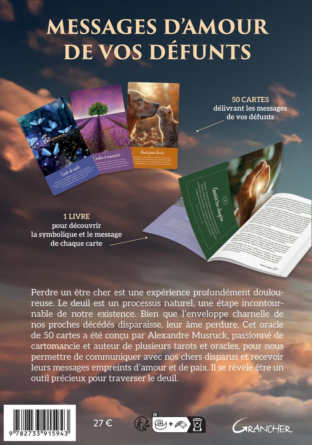 Découvrez une façon réconfortante de communiquer avec vos défunts avec des cartes lumineuses et apaisantes. Perdre un être cher est une expérience profondément douloureuse. Le deuil est un processus naturel, une étape incontournable de notre existence. Bien que l’enveloppe charnelle de nos proches décédés disparaisse, leur âme perdure. Malgré la séparation physique, nos chers défunts continuent à nous aimer, à veiller sur nous et à nous soutenir, comme ils le faisaient de leur vivant. Cet oracle de 50 cartes a été conçu par Alexandre Musruck, passionné de cartomancie et auteur de plusieurs tarots et oracles, pour nous permettre de communiquer avec nos chers disparus et recevoir leurs messages empreints d’amour et de paix. Il se révèle être un outil précieux pour traverser le deuil.